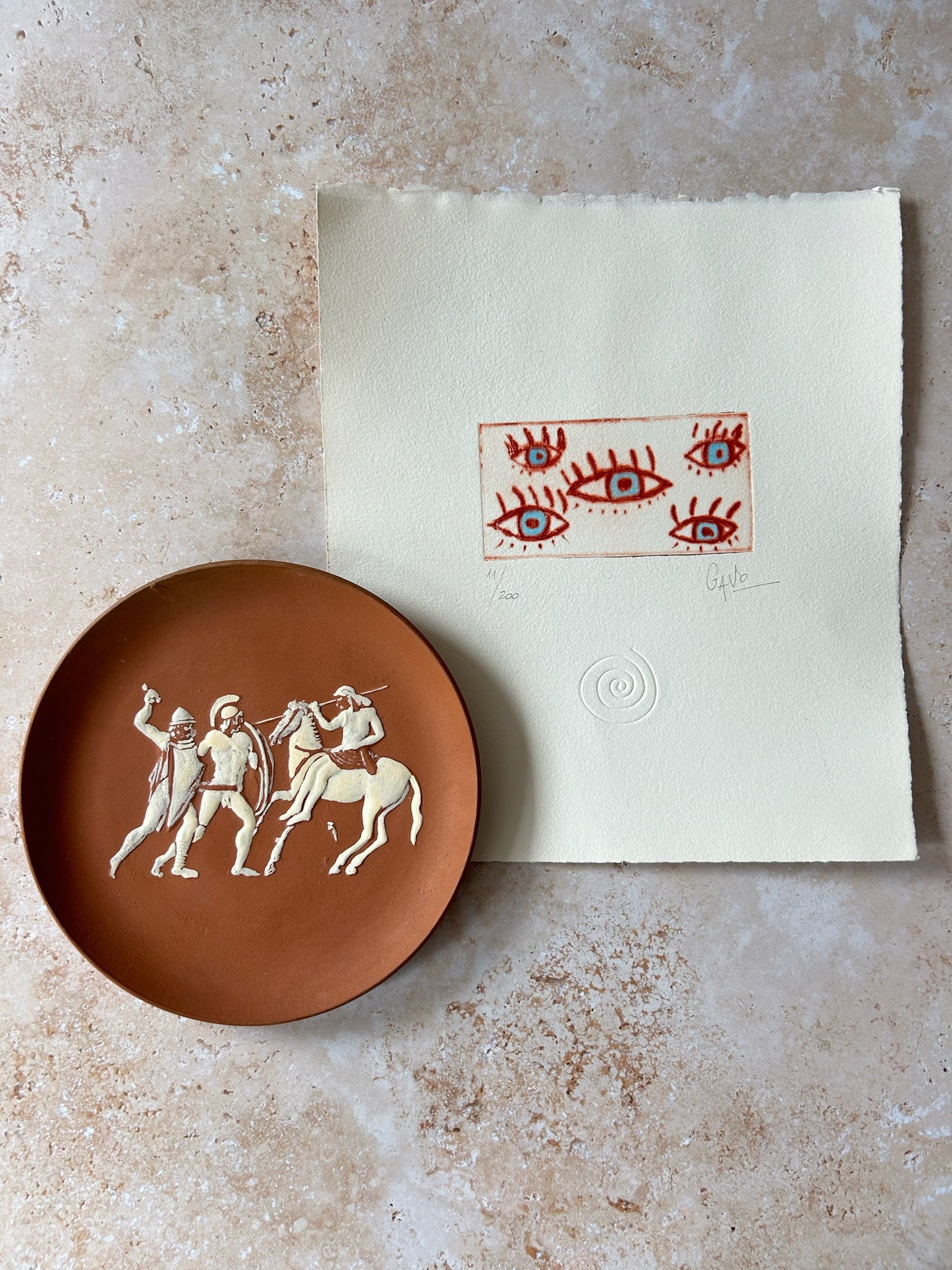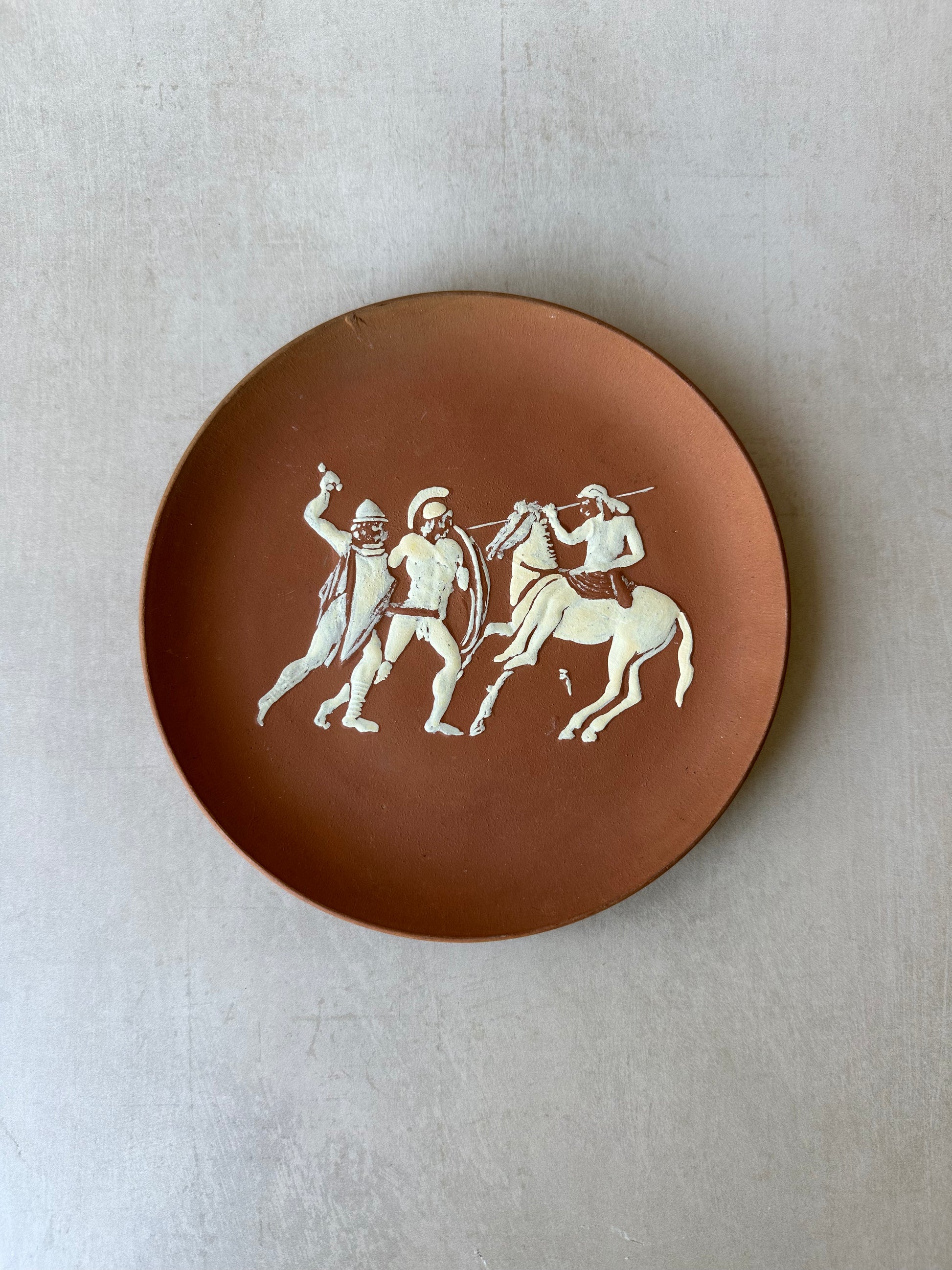 Plat mural en terre cuite représentant un cheval de Troie